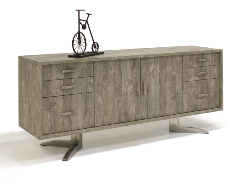 The Marco Credenza is a unique credenza with its rustic gray veneer and matte finish. The credenza rests on two stainless steel v-shaped legs. The credenza features 4 drawers, 2 file drawers and 2 doors with a center shelf. The credenza is a large and elegant complimentary piece to the desk or as a standalone piece.