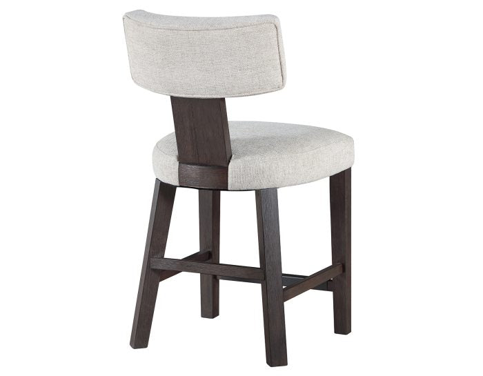 - 24″ stools feature floating barrel-style backrests with exposed wood posts for ergonomic comfort and modern appeal.
