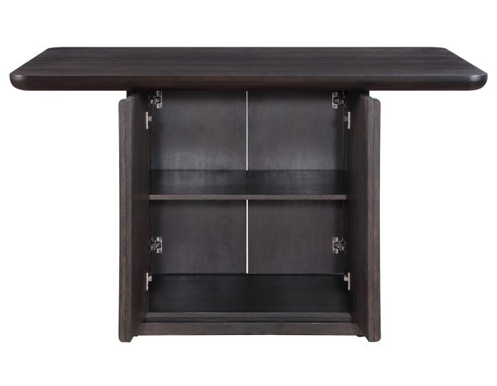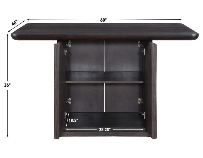 Elevate your kitchen or dining area with the Oakley 5-Piece Counter Set. The 60″ counter-height table includes discreet storage behind dual doors and an interior shelf, ideal for storing dining essentials within reach. Finished in a sophisticated charcoal brown, the table features rounded corners and a cove bullnose edge for a contemporary look. Four counter stools provide exceptional comfort, boasting upholstered barrel-style backs and cushioned seats covered in light gray herringbone fabric. Combining practical durability with understated elegance, Oakley is designed for everyday use.