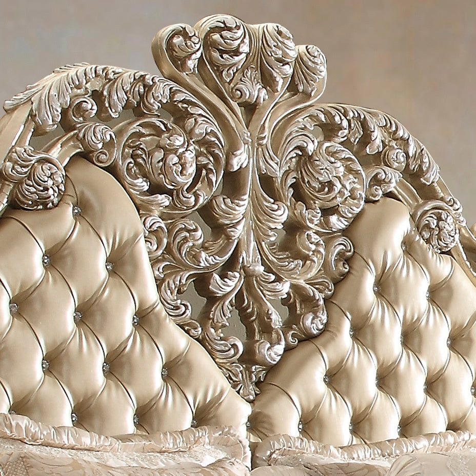 The HD-8022 Luxury Ornate Old World Leaf Bed serves as a sophisticated centerpiece, featuring a crystal-tufted headboard and footboard, elegant faux leather upholstery, and detailed tipped scrolling for an extravagant look. Complementing the bed, the nightstand and dresser combine stylish design with generous storage solutions for your bedroom necessities.