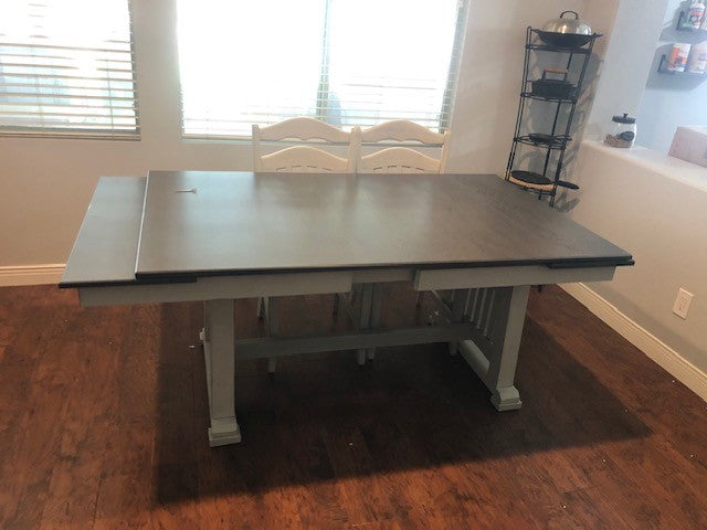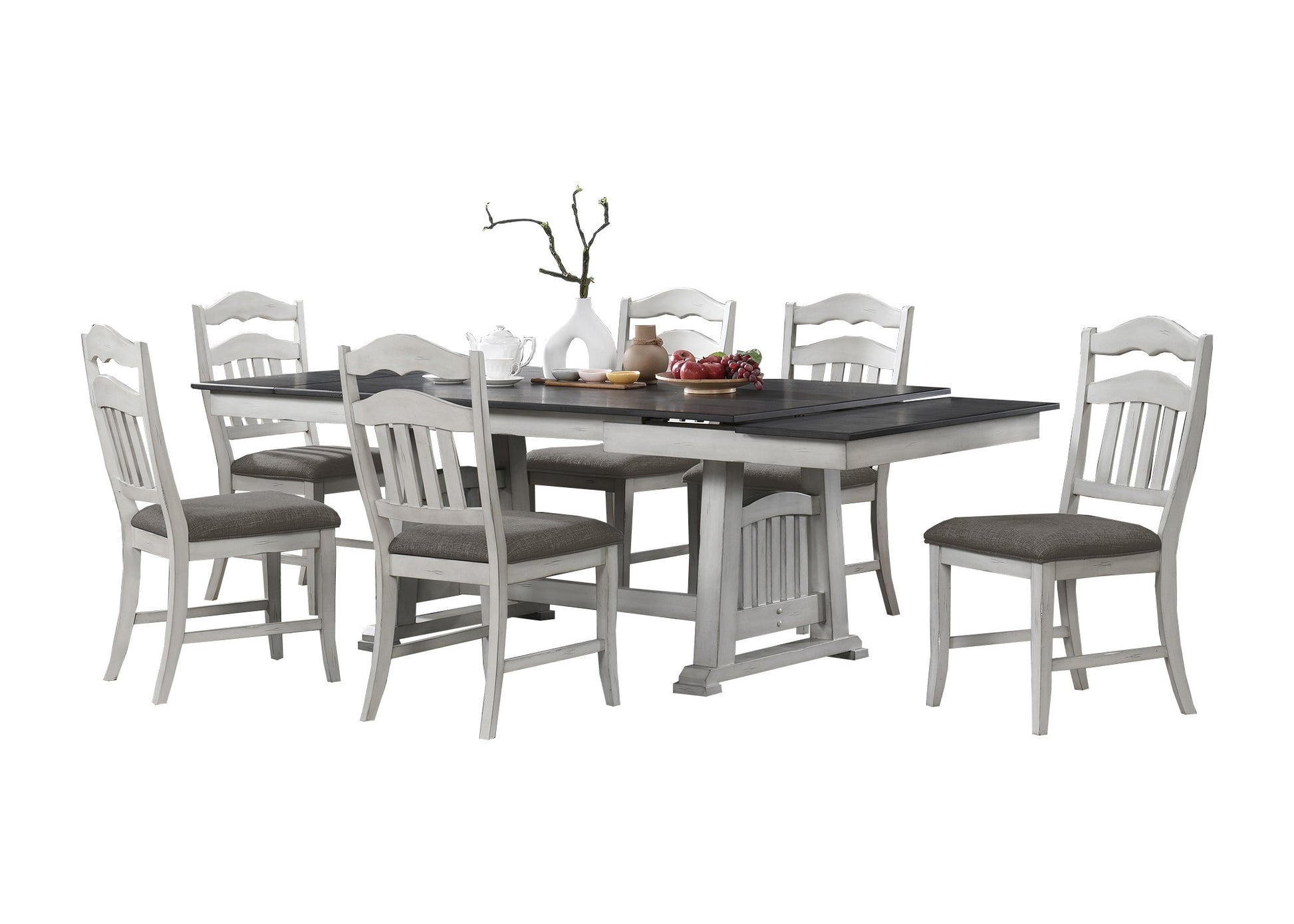 Perfect for hosting dinner parties or enjoying a casual family meal, our Dining Table creates an unforgettable backdrop for any occasion. With the ability to comfortably seat up to 6 guests and easily extend with two additional leaves, this table makes entertaining a breeze. The sleek gray finish adds a modern touch to your decor, while the rustic white base adds charm and character. The trestle base design provides both stability and elegance. For a complete dining set, consider purchasing the matching chairs separately.