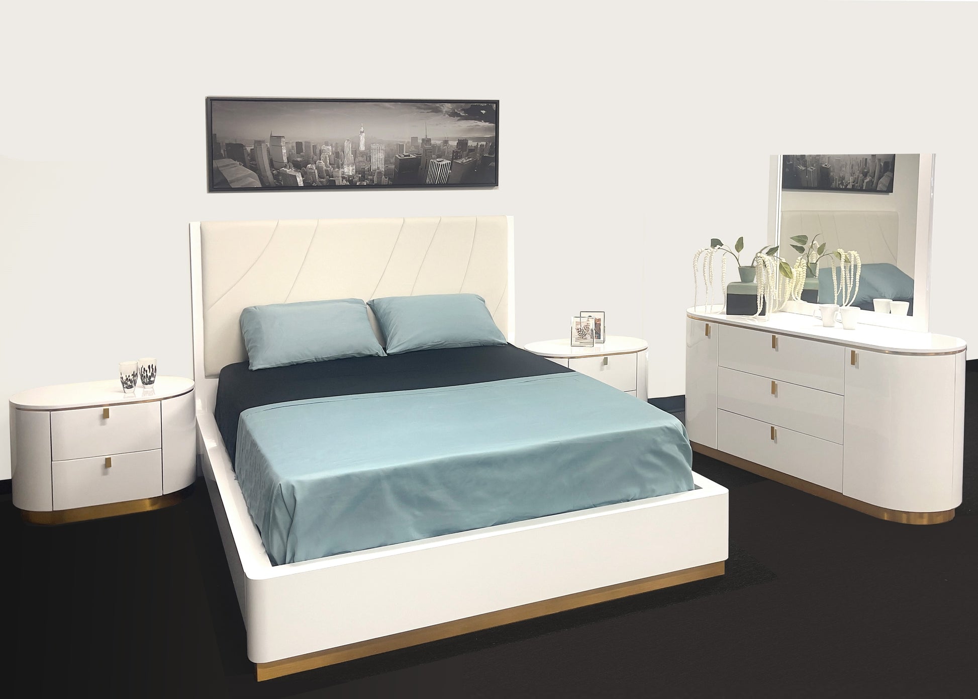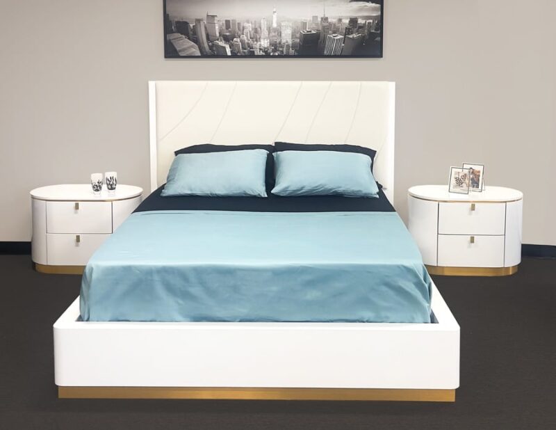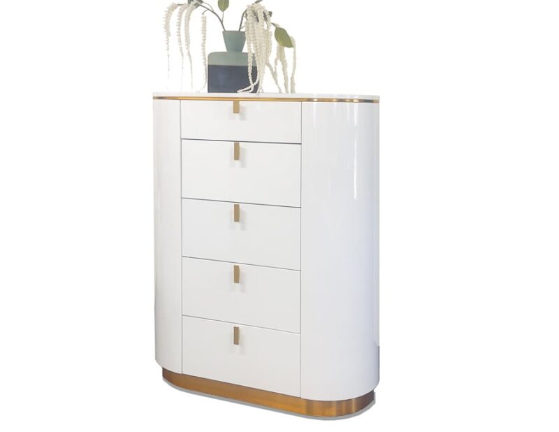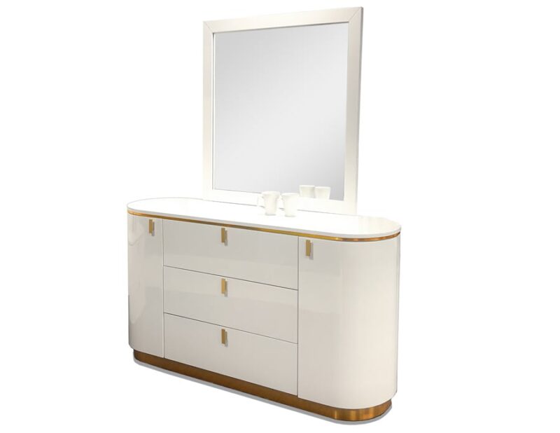 This contemporary Prada Bedroom by Sharelle features signature round edges, a glossy white finish, & stunning gold accents. The headboard has a beige faux leather topping the white lacquer panel, while its platform stands 13.5" high. The Prada night stands feature round corners, gold accents, and two drawers each. Also with round corners/edges and gold accents, the Prada dresser has 2 rounded doors and 3 drawers, and comes with a mirror option. The optional Prada Chest has 5 drawers & round corners.