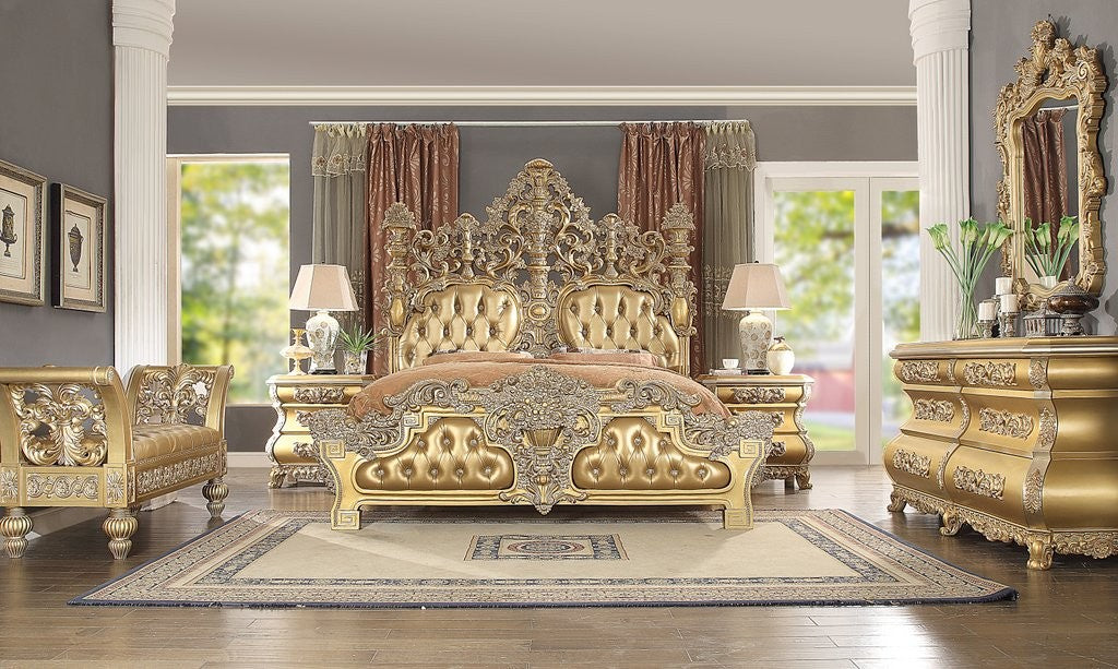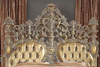You feel like an Egyptian King while sleeping in the plush comfort of the Victorian Carved Frame Bed by Homey Design. Offering a luxurious blend of style & comfort, all items included in this bedroom set make use of intricate carvings that showcase the richness of classic design forms. Wrapped in a gold-tone finish, the bed & case goods put forward an attractive profile that is beautifully complemented by gold-hued upholstered panels. The upholstered panels are further detailed with a button-tufted design to enhance the charm of this ensemble.