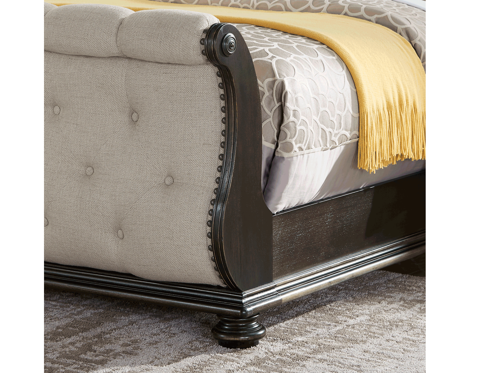 The Rhapsody Sleigh Bedroom Collection by Steve Miller embodies old-world charm with intricate scrollwork & romantic lines, finished in a multi-step molasses stain to create a look of permanence and nostalgia. With a scrolled button-tufted bed for added comfort, this collection will bring a timeless charm to any home.