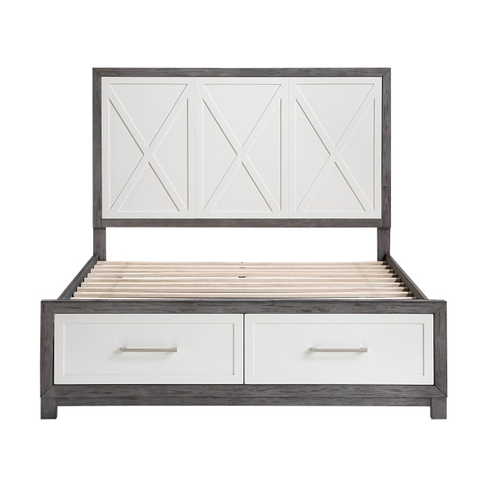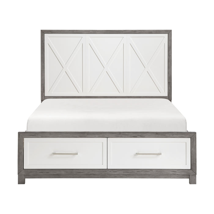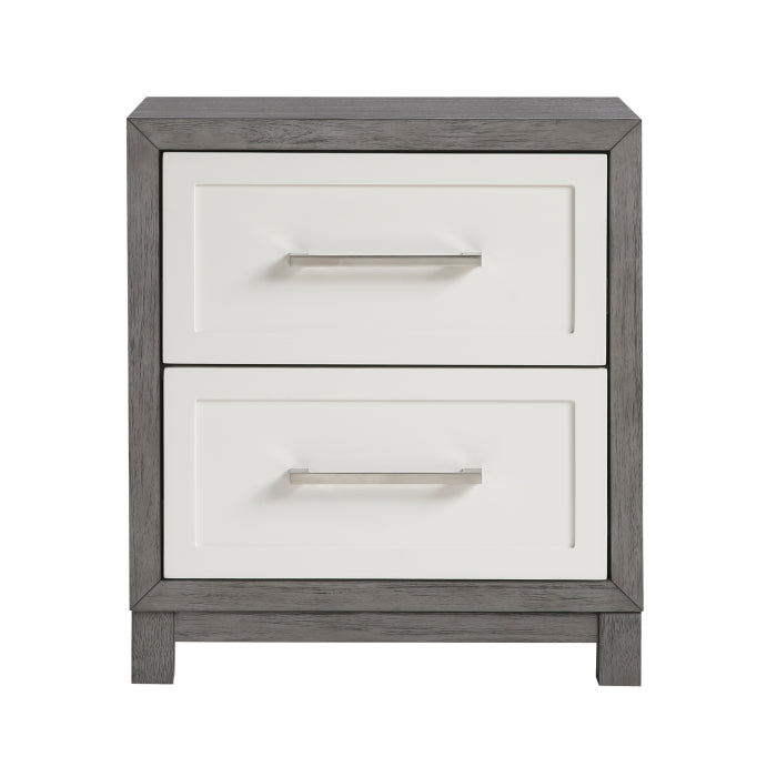 The Rowan Collection delivers a contemporary and functional bedroom set with a striking two-tone ivory and gray finish. Made from okume veneer, wood, and engineered wood, this collection includes platform beds in California King, Eastern King, Queen, and Full sizes, each with built-in footboard storage drawers. Accompanying the beds are a nightstand, dresser, chest, and mirror, all featuring dovetail drawers with smooth ball-bearing glides and polished nickel-tone bar pulls. With ample storage and a cohesive, modern design, the collection provides a platform bed design that eliminates the need for a box spring. Assembly is required for all pieces.