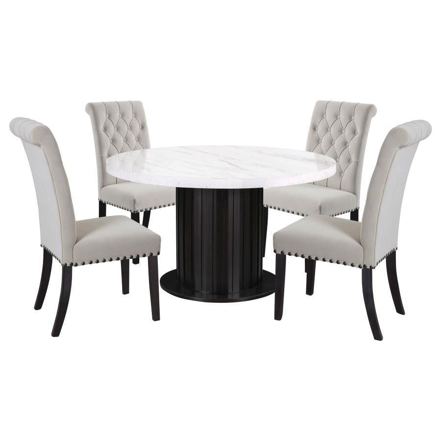 This sophisticated, modern, 5-piece dining set enhances formal dining occasions with its circular, white cultured marble top and rustic espresso pedestal base table, along with four parson style side chairs upholstered in fabric. Classic touches such as button-tufted rolled backrests, prominent nailhead trim, and flared legs add a contemporary twist to the overall design.