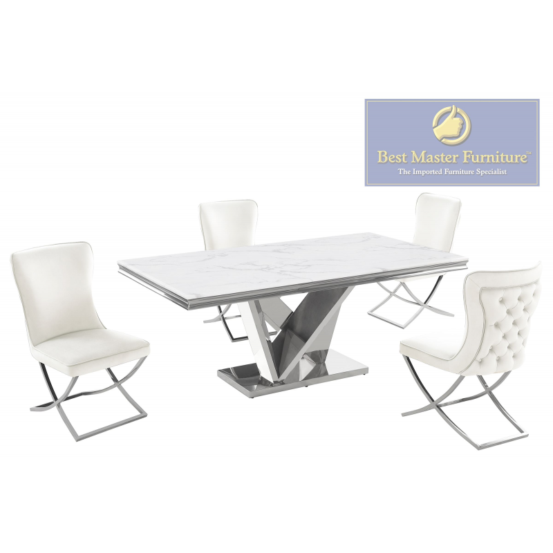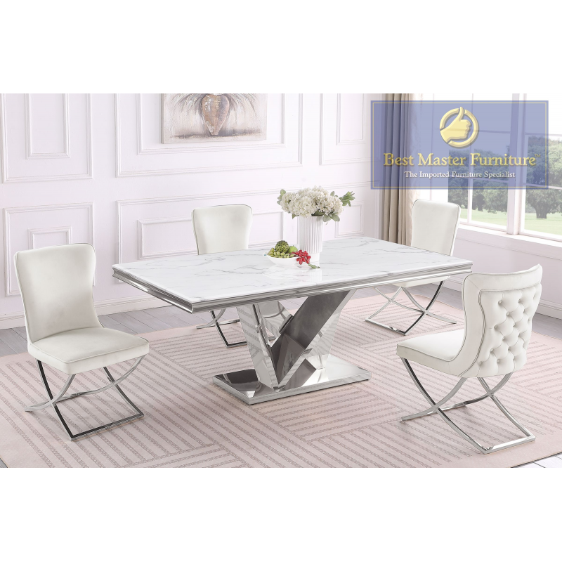 Materials: TABLE - Stone Marble Laminate Top & Metal CHAIRS - Velvet & Metal