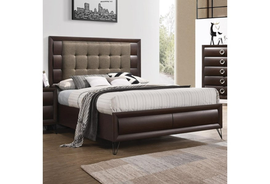 The sleek lines & transitional look of the Tablita panel bed make it an ideal addition to any bedroom. This contemporary bed features a rectangular headboard & low profile footboard in a rich dark merlot finish. This gorgeous bed features curved wood panels & a padded headboard with buttonless tufting. Accented with a multi tone fabric & metal V Shaped legs, this unique bed will add a touch of modern elegance & style to any bedroom.