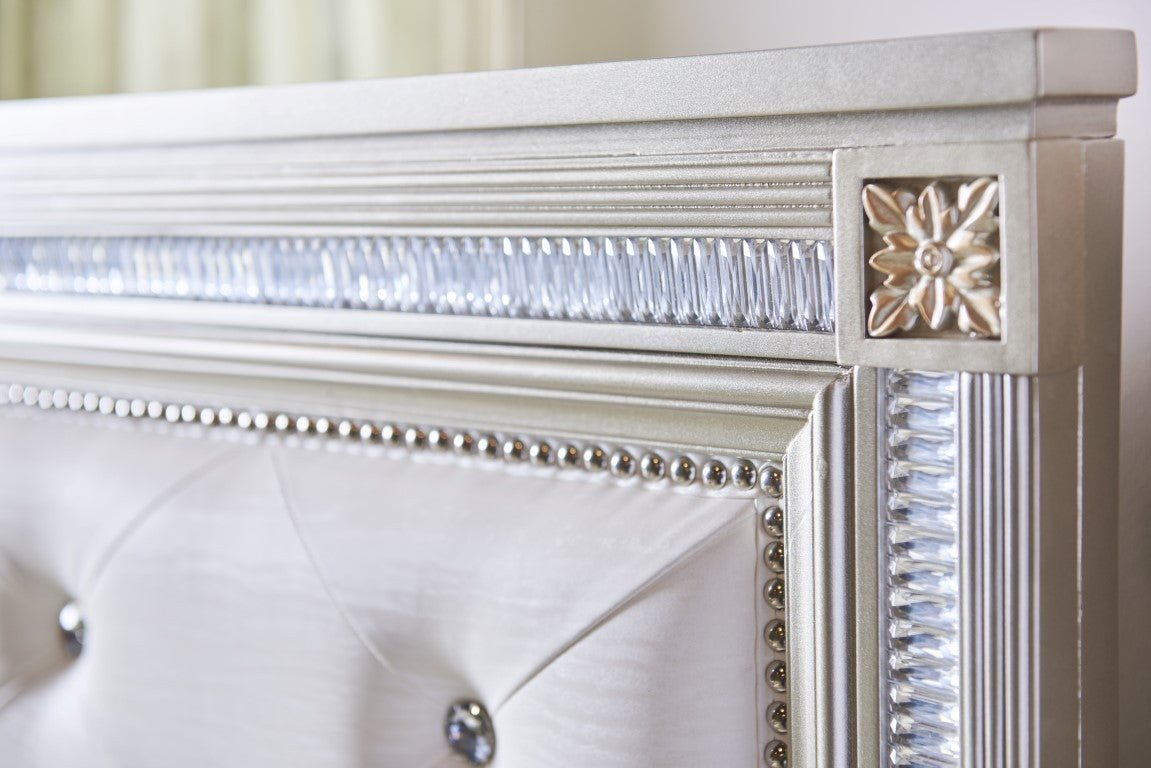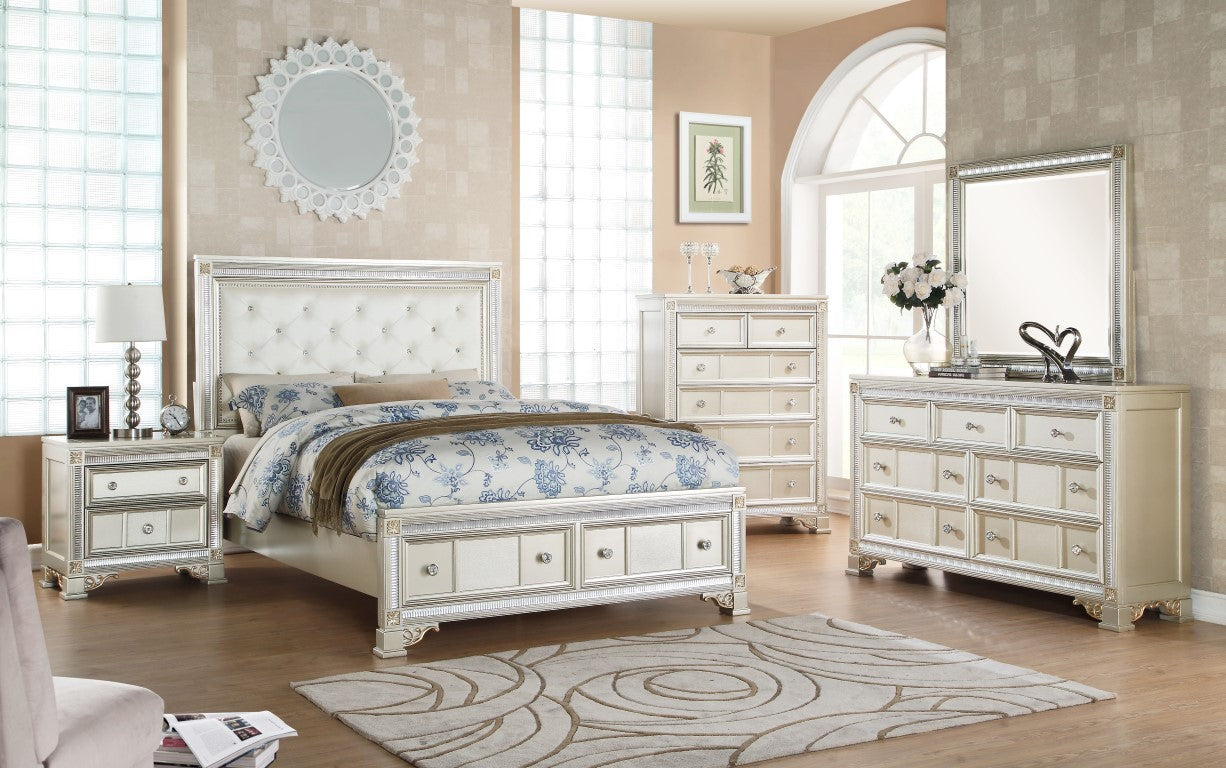The Tiffany bedroom collection by Oasis Home adds instant, modern-day luxury to any bedroom. Refined details such as the Pearl finish, textured drawer fronts, carved accents & faceted crystalline inlays come together in elegant allure. The headboard is upholstered in a creamy faux leather with button tufting & nailhead trim. Complete the set with the matching Tiffany vanity & stool for ultimate Hollywood glamour.
