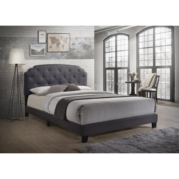 The Tradilla queen bed displays a timeless design. Its platform style frame is upholstered in padded fabric, complemented by a button tufted diamond pattern on the headboard. Nailhead trim accentuates the traditional shape of the headboard, while wood feet and posts support the frame. This bed is versatile and has the potential to complete any bedroom.