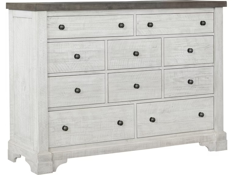 Introducing the Valley Ridge collection - an updated take on the classic farmhouse aesthetic. This stunning line boasts a distressed white finish and gray-washed wood tone tops, creating a beautiful contrast. With charming details like plank-effect panels, bracket feet, and bronze finished hardware, each piece exudes a rustic charm. The headboard is a standout, featuring simple pilasters and a substantial entablature, along with convenient LED lighting. Warm, stylish, and inviting, Valley Ridge is a must-have for any home.