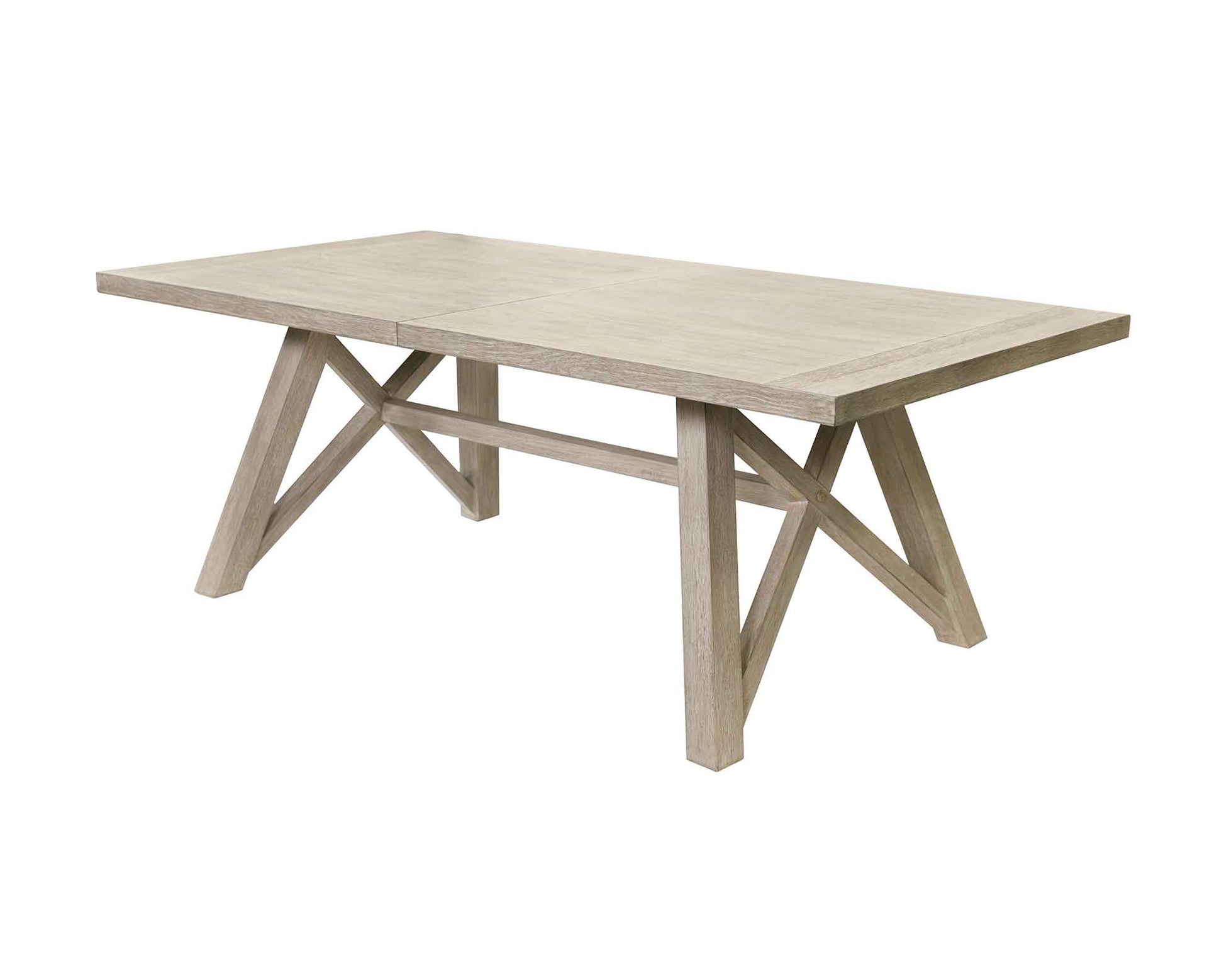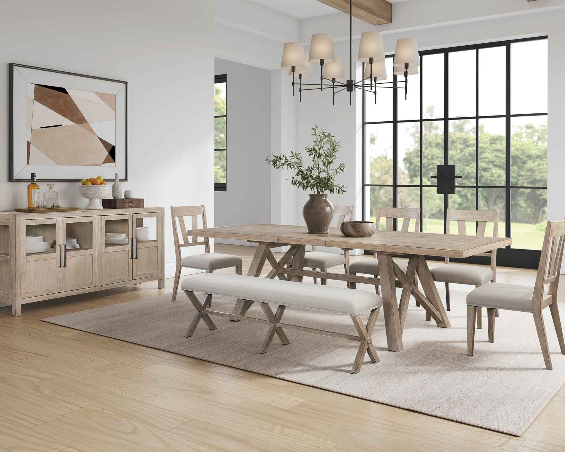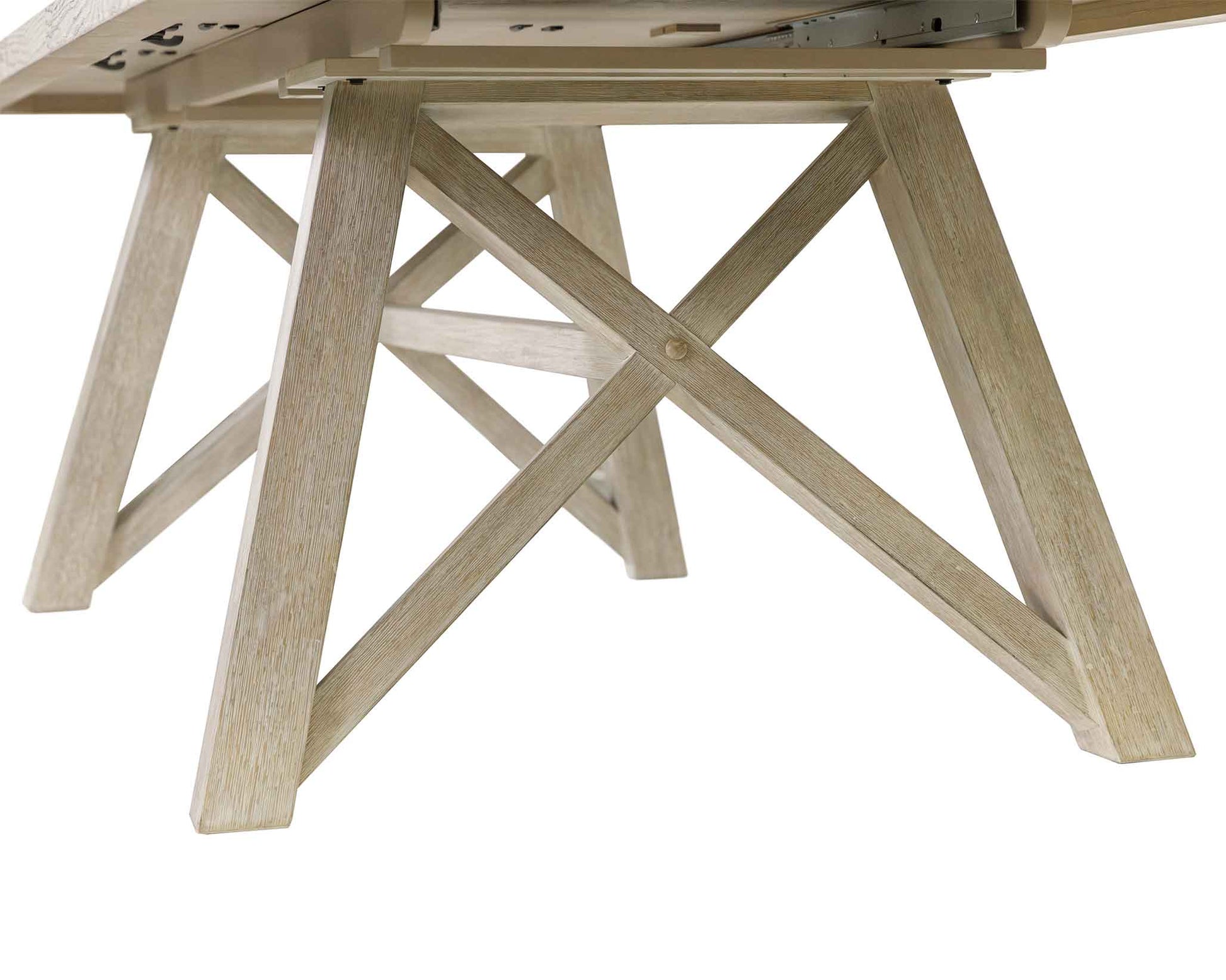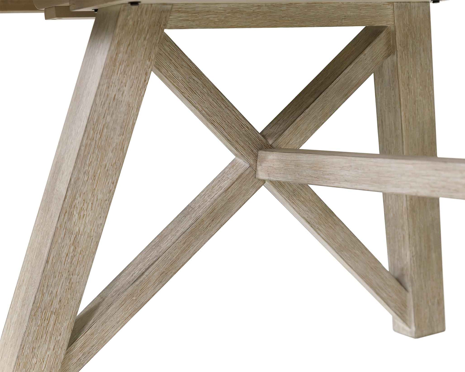 X-shaped sawhorse table base enhances the modern farmhouse style