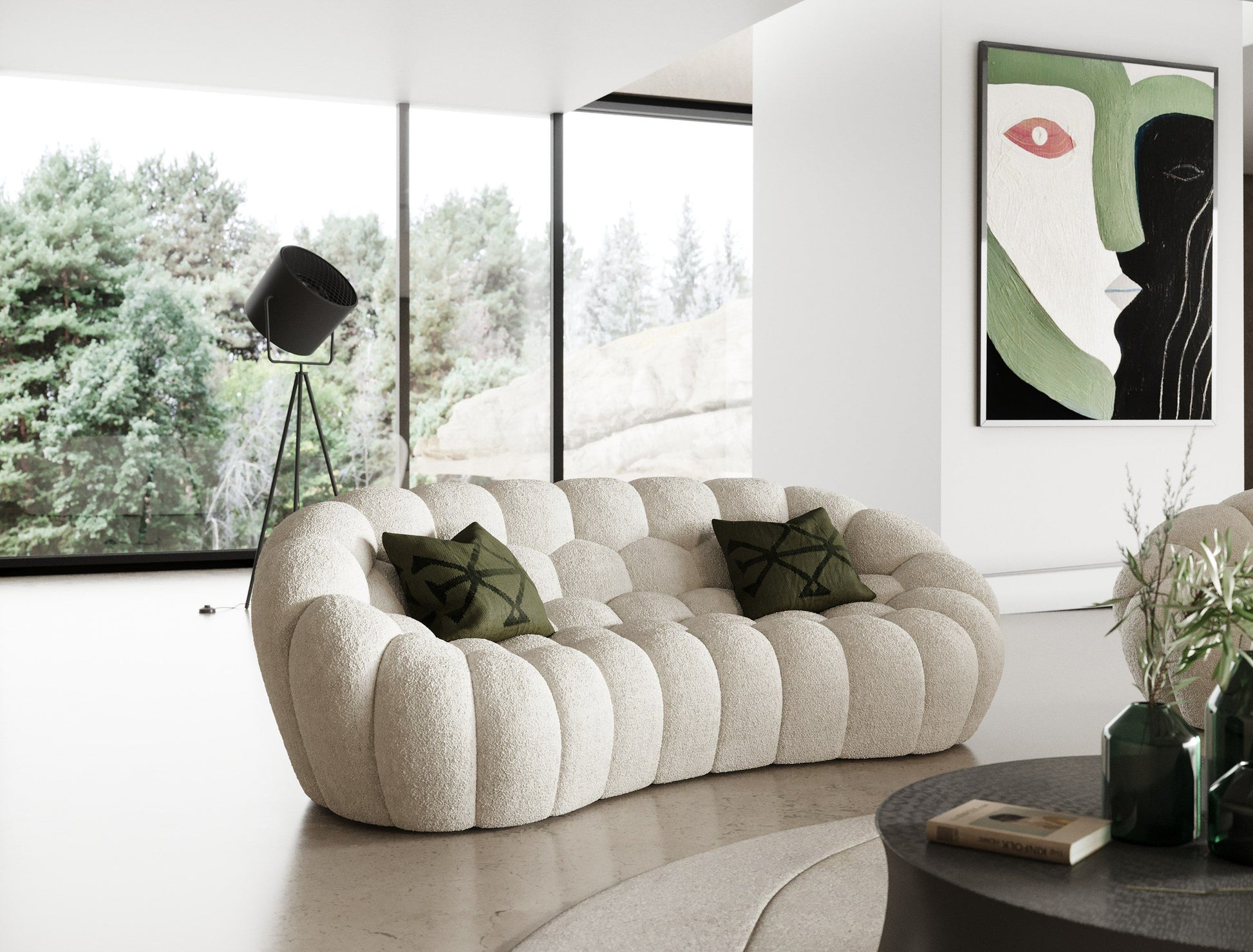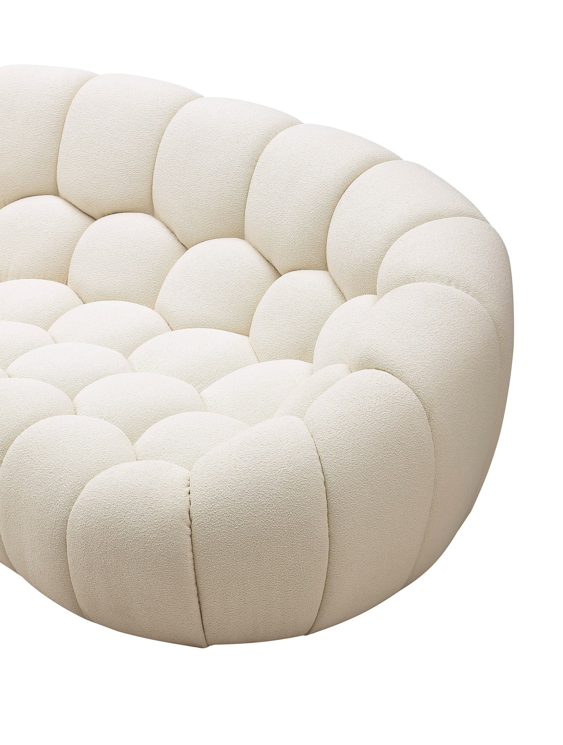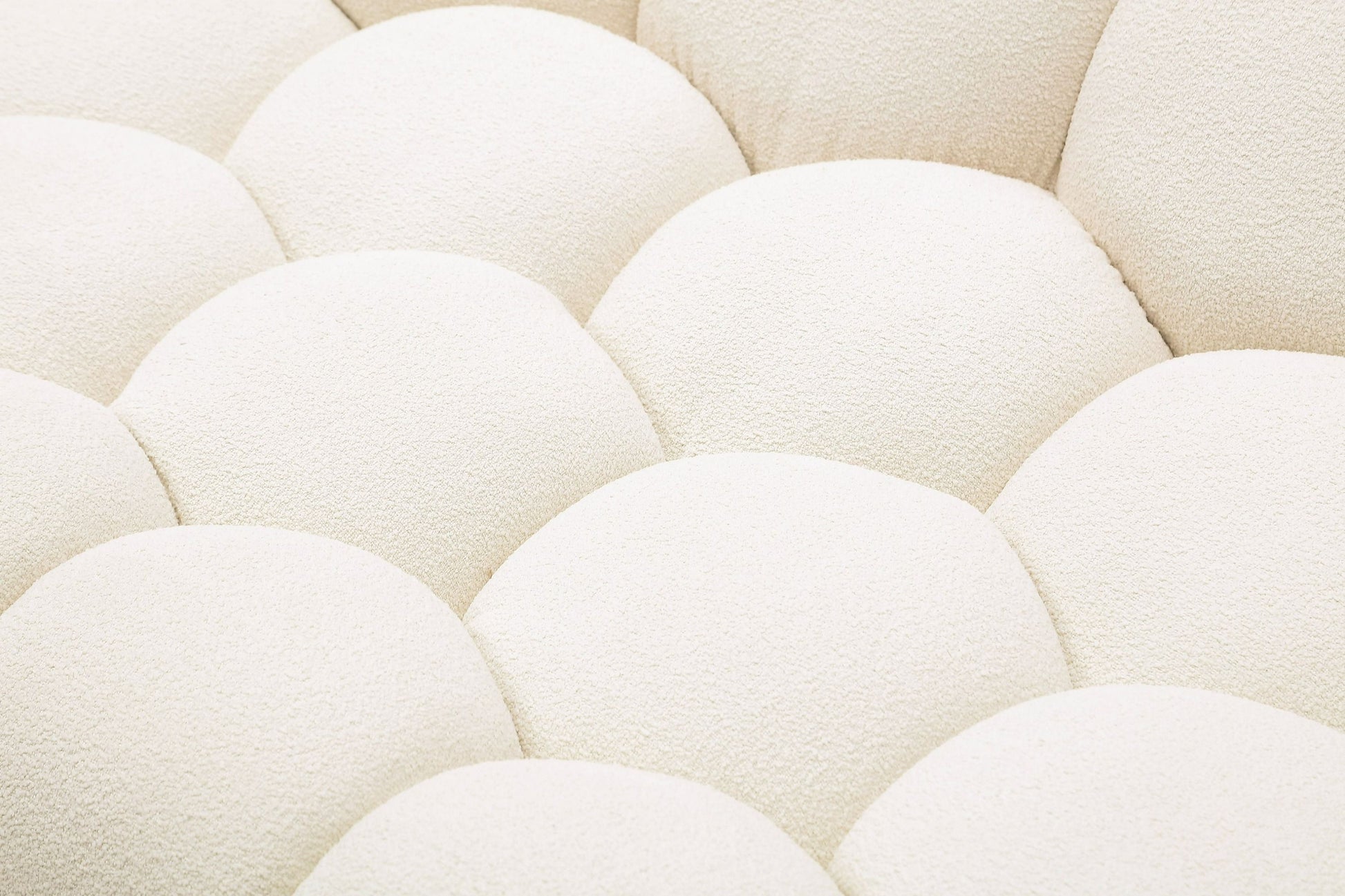 The Yolonda Loveseat features a distinctive curved design in modern off-white, presenting a sophisticated option for your living space. Its hexagonal tufted cushions deliver an innovative and elegant look, while the teddy fabric upholstery ensures exceptional comfort. This collection also includes a Sectional Sofa, Standard Sofa, and Accent Chair, allowing for versatile styling throughout your home.